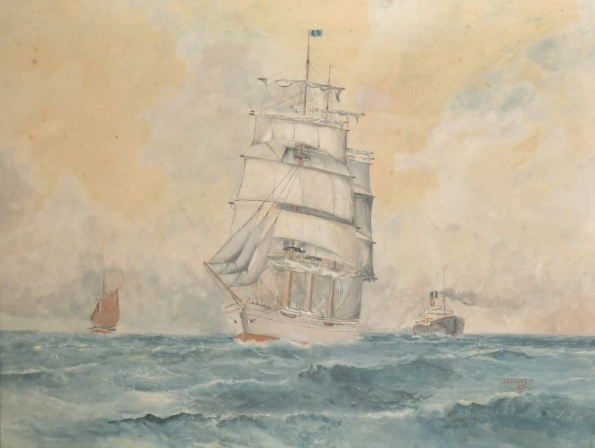 English School, circa 1931, a 3-masted clipper with a steam ship beyond, watercolour, indistinctly signed, 10" x 13.5".
