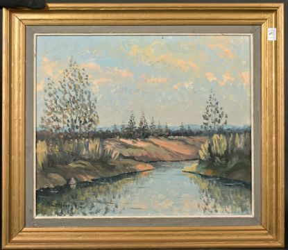 20th Century Scandinavian School, River landscape, oil on board, indistinctly signed, 18.5" x 21.5".