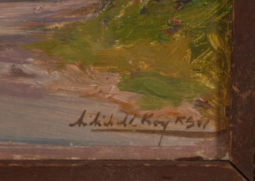 Archibald Kay (1860-1935) Scottish, A shepherd and his flock on a country path, oil on canvas board, signed, 9" x 7".