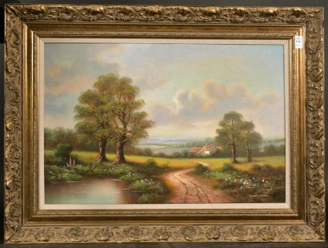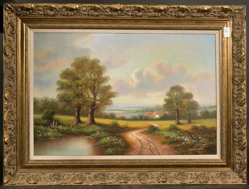 David Ronald (20th Century), a country path bordered by flowers leading to a cottage, oil on canvas, signed, 16" x 24".