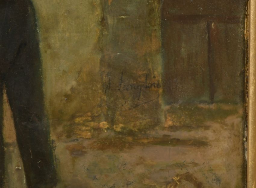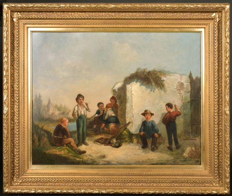 Jean-Charles Langlois (1789-1870) French, a group of children playing with village buildings beyond, oil on panel, 21.5" x 27.5".