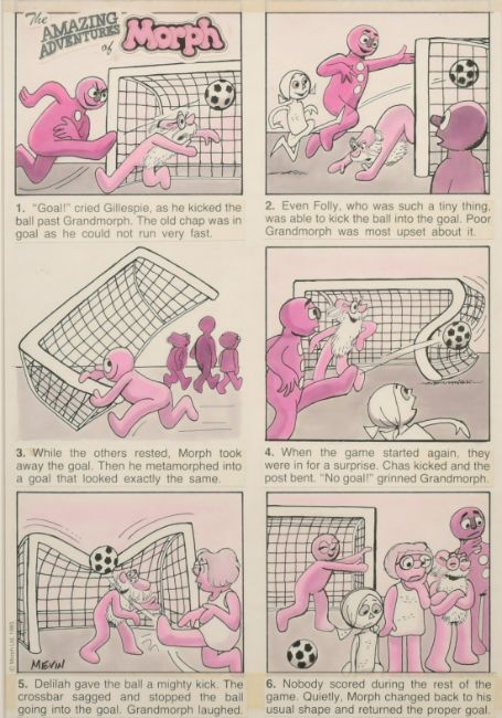 Bill Mevin (1922-2019) British, The Amazing Adventures of Morph, Goal, Morph Ltd 1983. A group of 6 drawings framed, signed, 15.25" x 10.5".