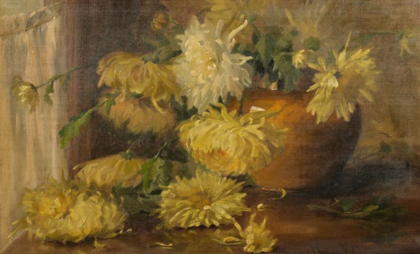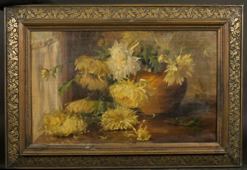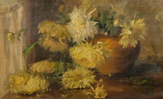 Early 20th Century Continental School, a still life study of chrysanthemums in a terracotta bowl, oil on canvas, indistinctly signed, 13.5" x 21.5".