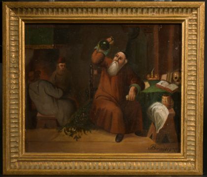 19th Century Continental School, A scene of an alchemist at work, oil on metal, and a similar scene probably by the same hand of a tavern interior, 7" x 8.25", (2).