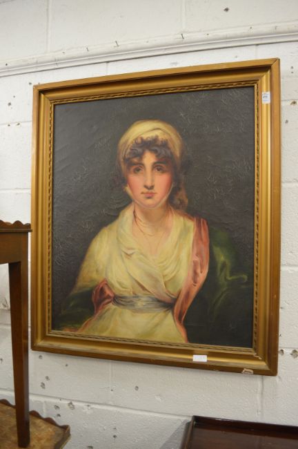A portrait of a young lady wearing a green and cream dress, oil on canvas.