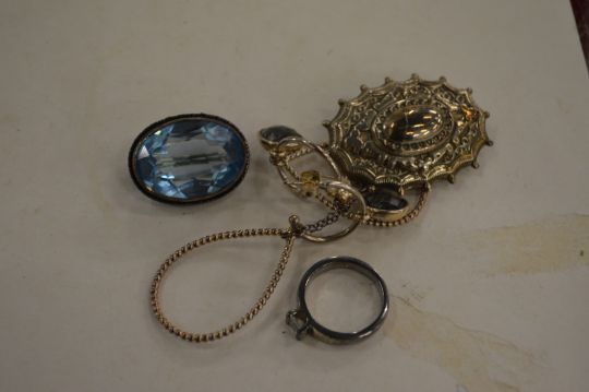 A silver ring and a decorative brooch etc.