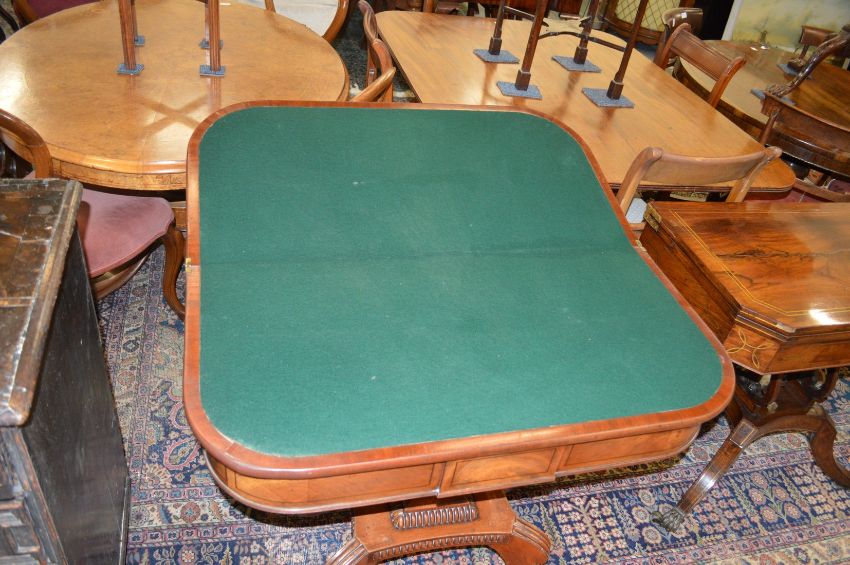 A 19th century mahogany D-shaped foldover card table on a square column support platform base with four outswept legs with brass castors.