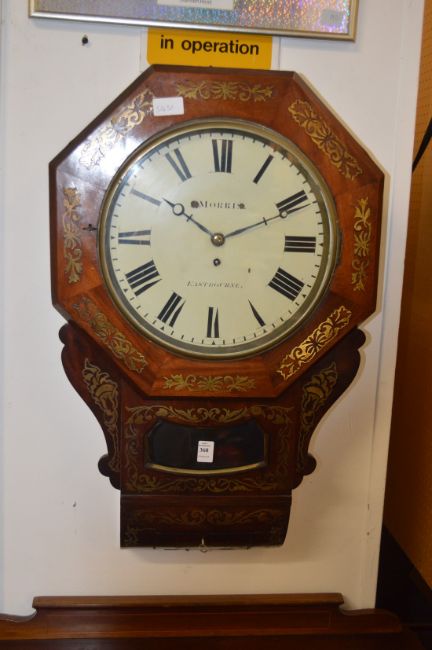 A Victorian mahogany and brass inlaid octagonal shaped drop dial wall clock, the dial signed Morris, Eastbourne.