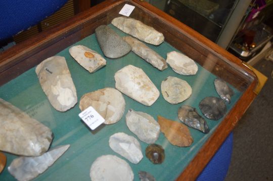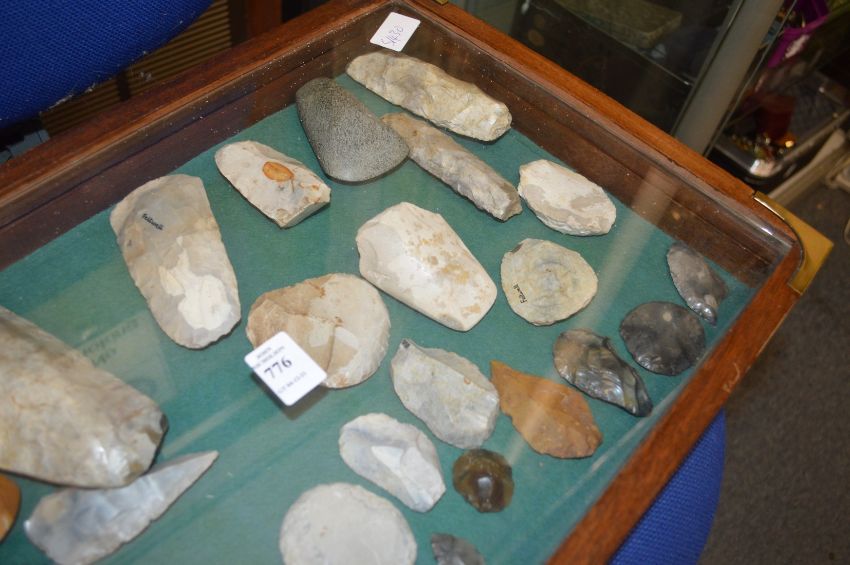 A mahogany display case containing a good collection of stone axes, flint spear and arrow heads etc.