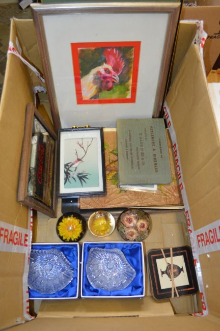 Decorative pictures, a pair of cut glass dishes, paperweights etc.