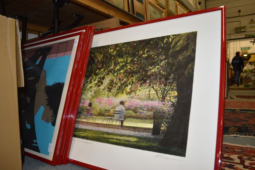 A group of four decorative colour prints, uniformly framed and glazed.