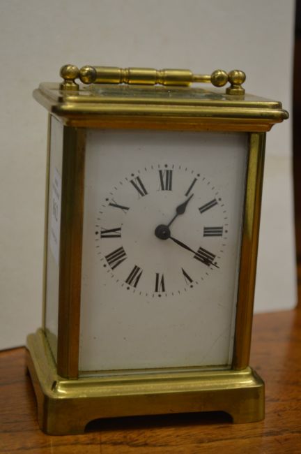 A brass carriage clock.