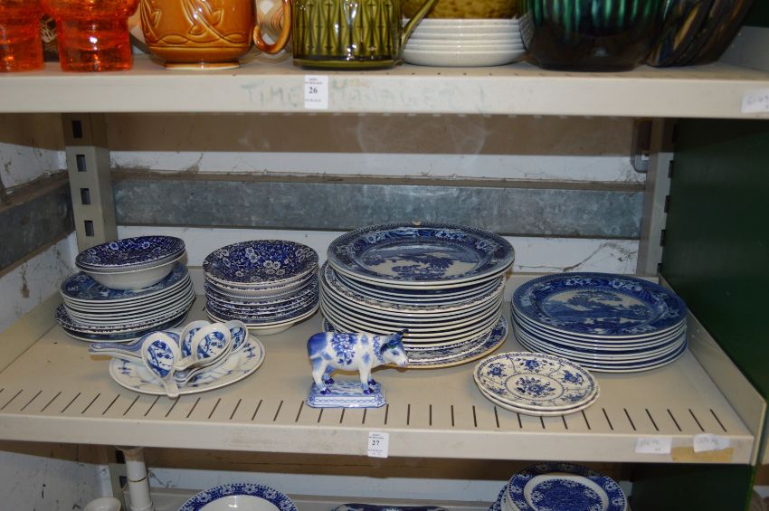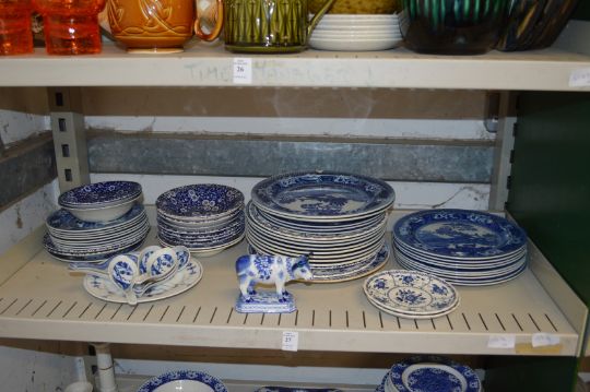 A large quantity of blue and white china to include Wedgwood Fallow Deer plates.