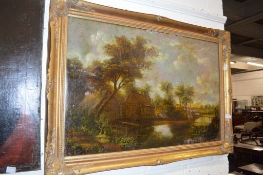 A rural landscape with a mill by a river, oil on canvas, in a decorative gilt frame.