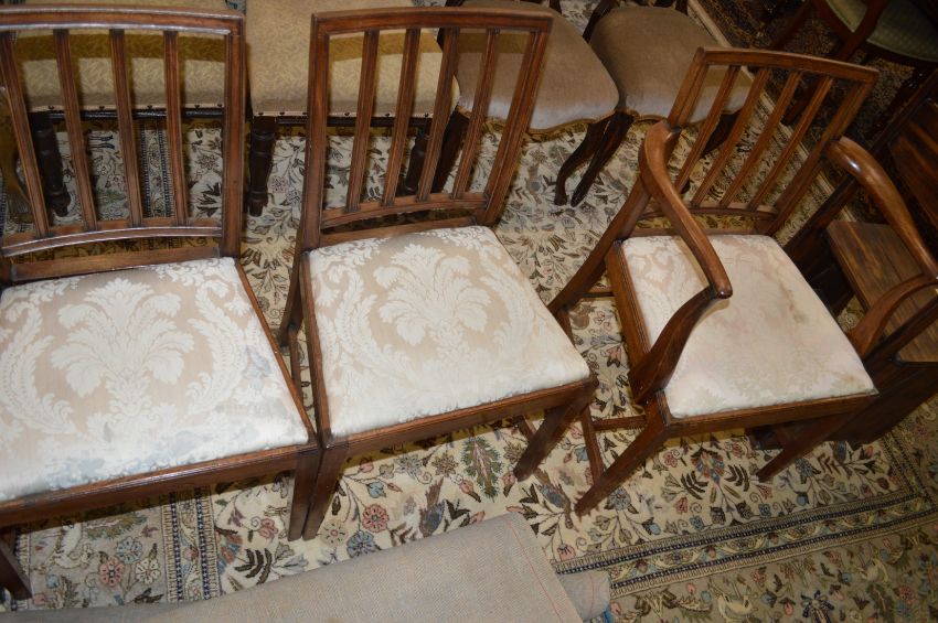 A matched set of eight George III design mahogany dining chairs, two with arms, all with vertical tie bars, drop-in seats, on stretchered tapering square legs.