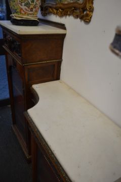 A good Victorian walnut, marble and ormolu mounted drop centre side cabinet, possibly by Gillow.