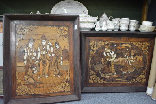 Two eastern inlaid pictures depicting figures on a verandah and in a landscape.
