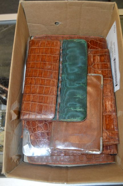 A silver mounted leather blotter, a similar wallet and other leather items.