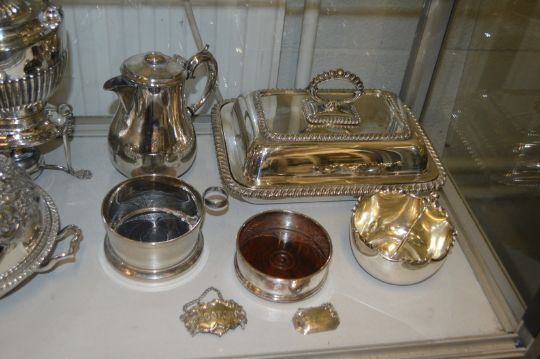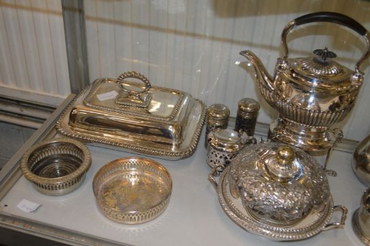 A pair of silver plated entree dishes and covers, a kettle on stand with burner, a good muffin dish and other plated wares.