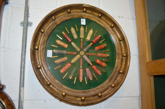 Shooting interest, a collection of early shotgun cartridges and bullets decoratively mounted in a circular gilt frame.