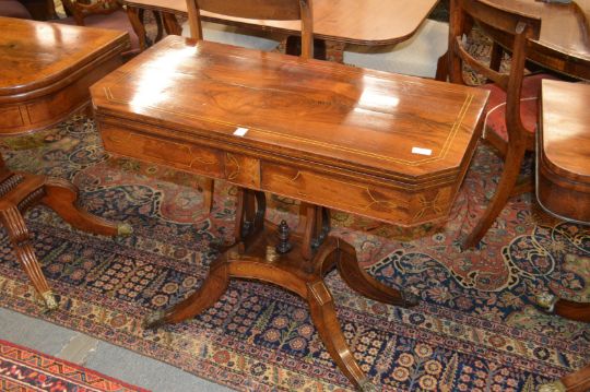A Regency rosewood and brass inlaid foldover card table, the rectangular top with clipped corners on a twin lyre shaped support with platform base, four outswept legs with brass castors.
