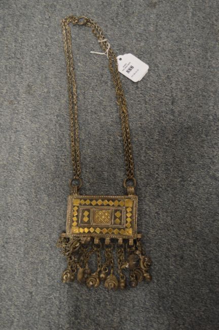 An eastern white metal rectangular large pendant and chain.