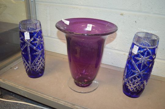 A large amethyst tinted glass vase and a pair of blue Bohemian glass vases.