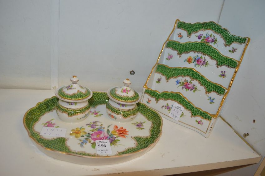 A porcelain desk set comprising a tray with two inkwells and a letter rack, all floral decorated with green fish scale borders.