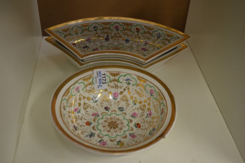 A floral and gilt decorated bowl together with a pair of crescent shaped dishes to match.