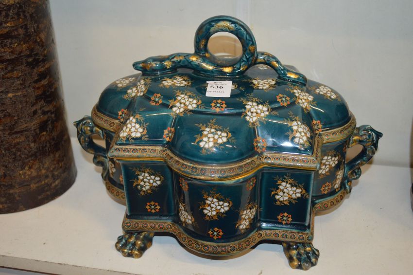 A continental turquoise glazed pottery box and cover, the handle modelled as a serpent.