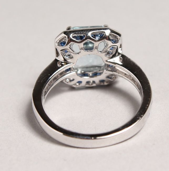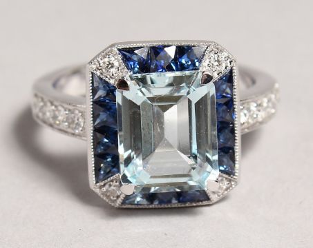 A SUPERB 18CT WHITE GOLD, AQUAMARINE, SAPPHIRE AND DIAMOND SET DECO DESIGN RING.