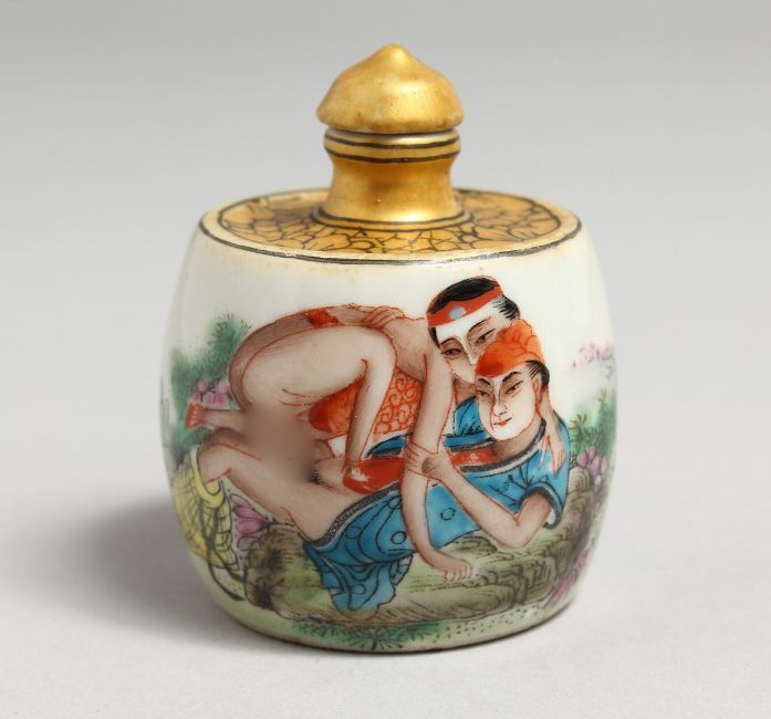 A CHINESE PORCELAIN EROTIC SNUFF BOTTLE.