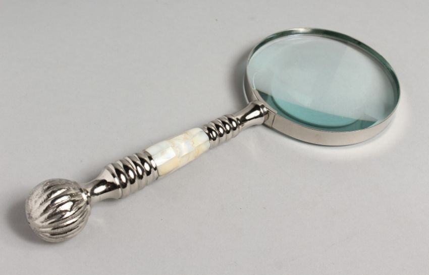 A NOVELTY MAGNIFYING GLASS with mother-of-pearl and chrome handle.