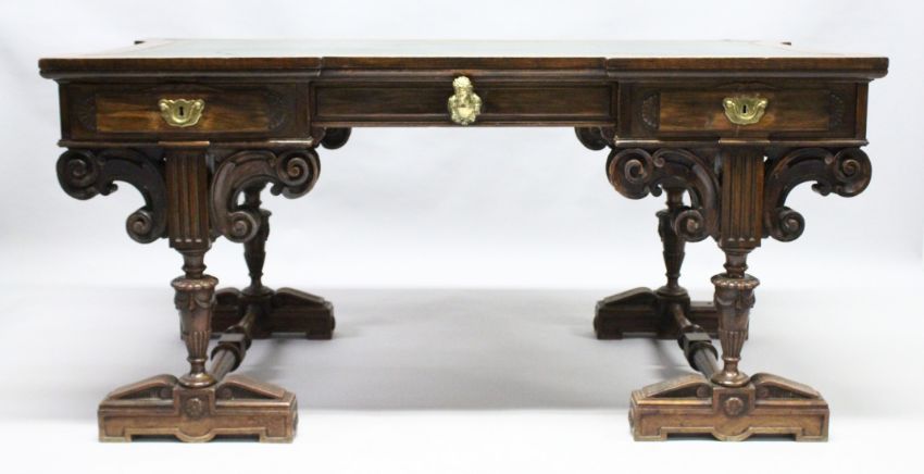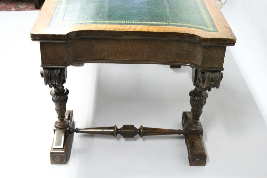 A VICTORIAN WALNUT DESK by MORANT, BOYD & BLANDFORD, 91 NEW BOND ST., the rectangular top of breakfront outline, with concave ends, inset with a green leather writing surface over three frieze drawers on carved bracketed supports, urn form legs on stretchered block feet.