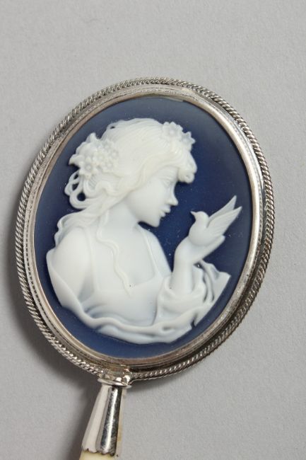 A SILVER CAMEO HAND MIRROR.