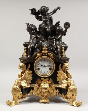 A VERY GOOD FRENCH BRONZE AND ORMOLU CLOCK, with three bronze cupids and gilt bronze and ormolu mounts.