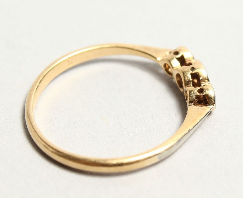 A 18CT GOLD THREE STONE DIAMOND RING.