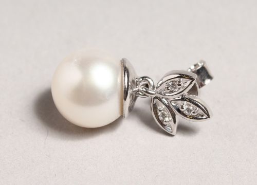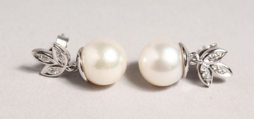 A PAIR OF PEARL AND DIAMOND DROP EARRINGS in 18ct white gold.