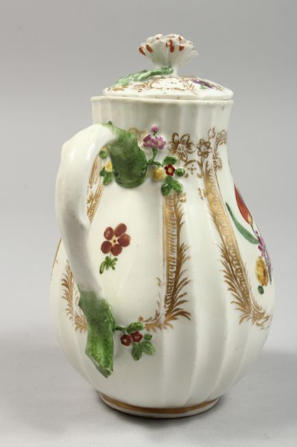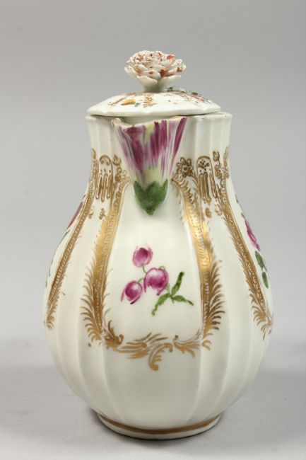 A GOOD MEISSEN RIBBED JUG AND COVER painted with flowers.