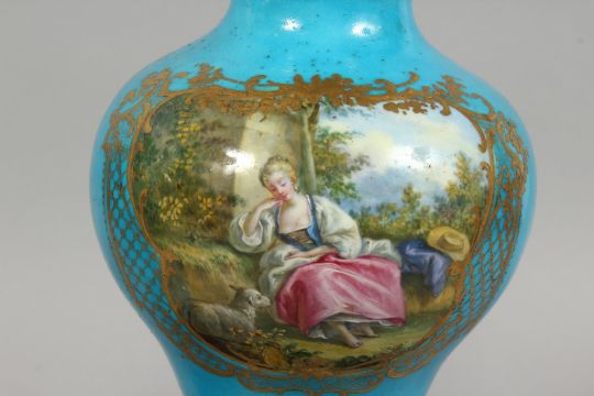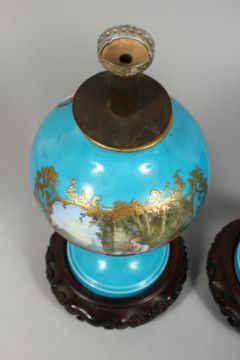 A VERY GOOD PAIR OF 19TH CENTURY SEVRES PORCELAIN LAMPS, painted with reverse panels of figures and birds on wooden bases.
