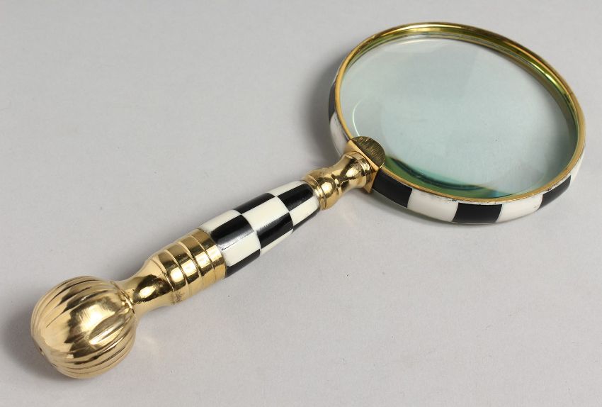 A NOVELTY MAGNIFYING GLASS with chequered and gilt handle.