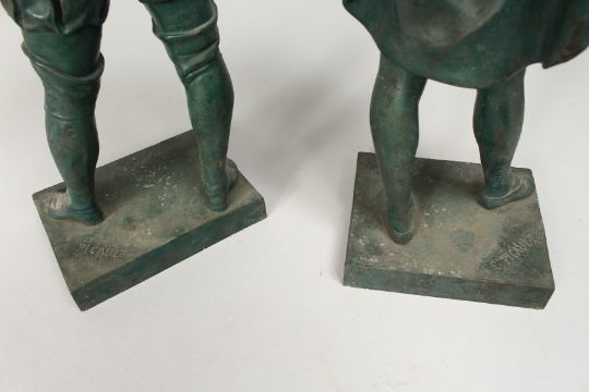 A GOOD PAIR OF BRONZE FIGURES OF YOUNG MEN, one playing a mandolin, the other on bugle.