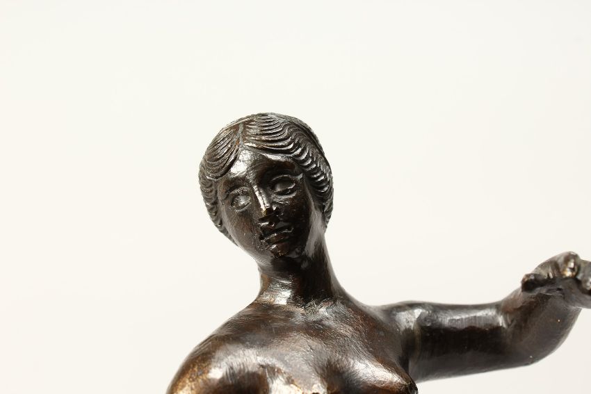 A BRONZE FIGURE OF A STANDING NUDE on one leg, on a circular base.