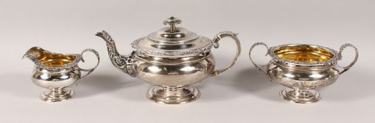 A GEORGE IV SCOTTISH SILVER THREE PIECE TEA SET, with cast shell and scroll sides, teapot, sugar basin and milk jug.