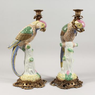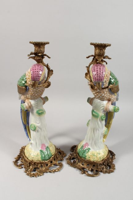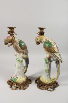 A GOOD PAIR OF PORCELAIN PARROT CANDLESTICKS with ormolu mounts.
