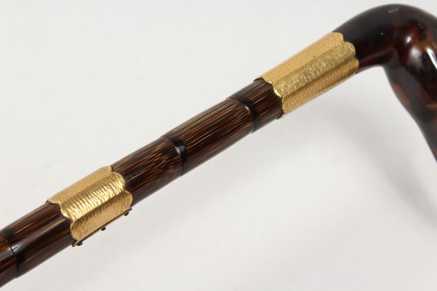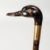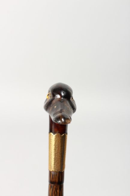 A VICTORIAN CARVED DUCK'S HEAD WALKING STICK, maker J. H. with two gilt bands, originally an umbrella.