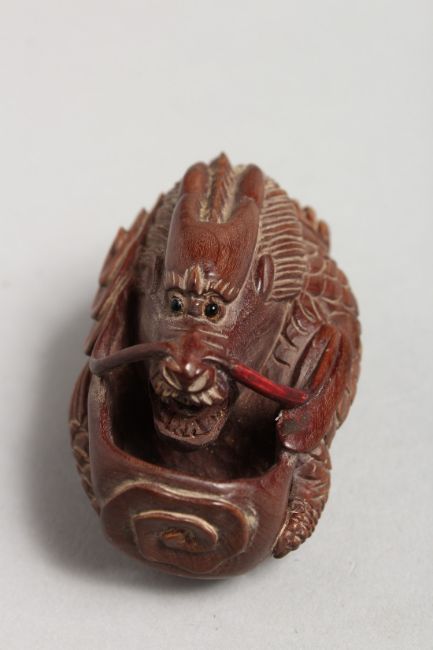 A JAPANESE CARVED WOOD DRAGON NETSUKE.