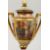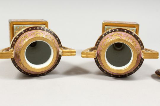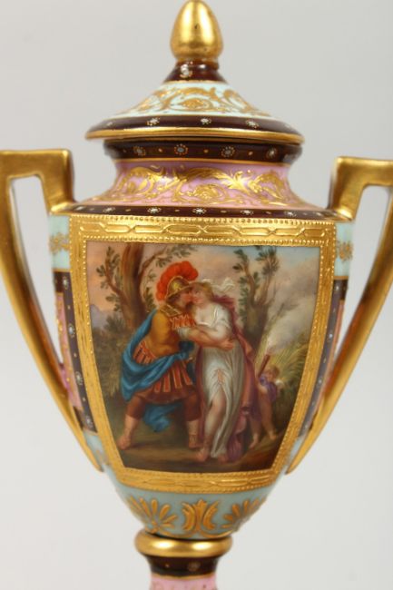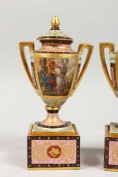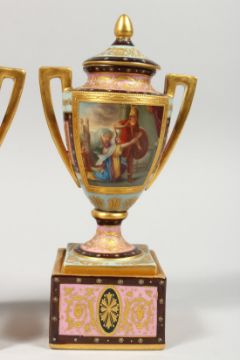 A GOOD SMALL PAIR OF BERLIN PORCELAIN TWO HANDLED URNS, COVERS AND STANDS painted with classical scenes.