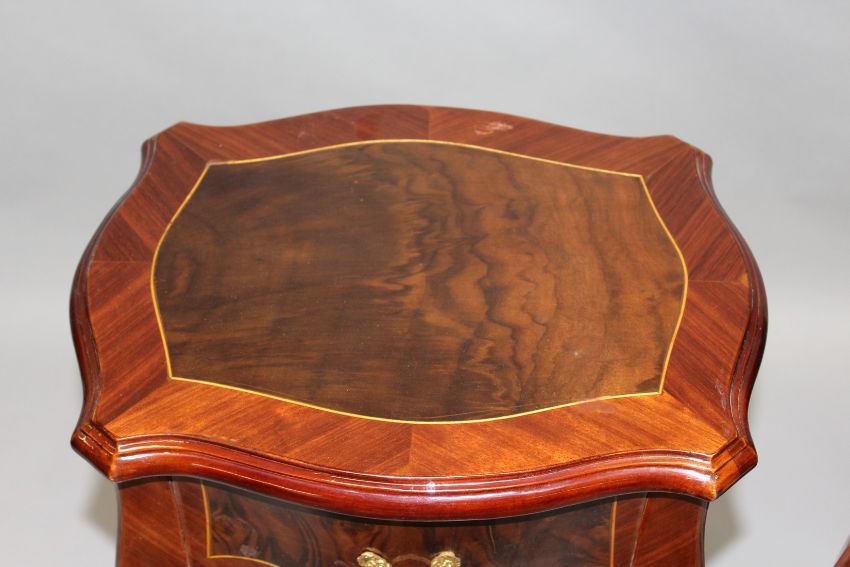 A PAIR OF FRENCH STYLE BEDSIDE TABLES with crossbanded tops, single drawer, on curving legs.