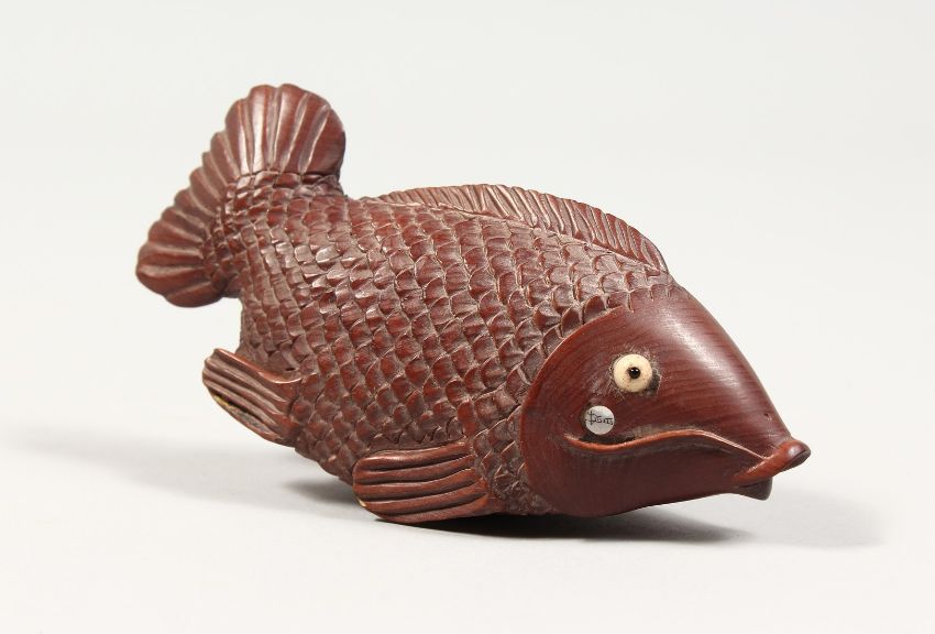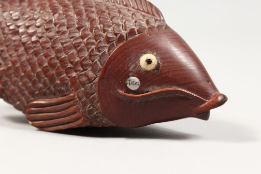 AN UNUSUAL CARVED WOOD CARP with a magnifying glass and compass.